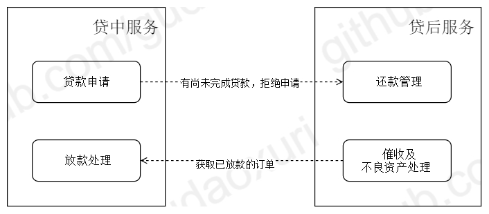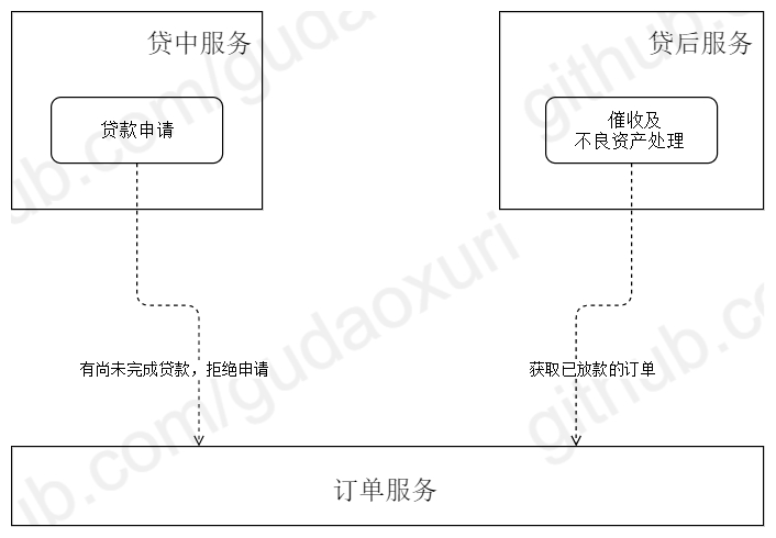 贷款申请时先做前置判断:如果该顾客尚有未完成的贷款则拒绝本次申请,在催收巡检时需要获取已放款的订单来确定要处理的数据,很不幸的是它们彼此存在于两个服务中。解决的方法有三种: