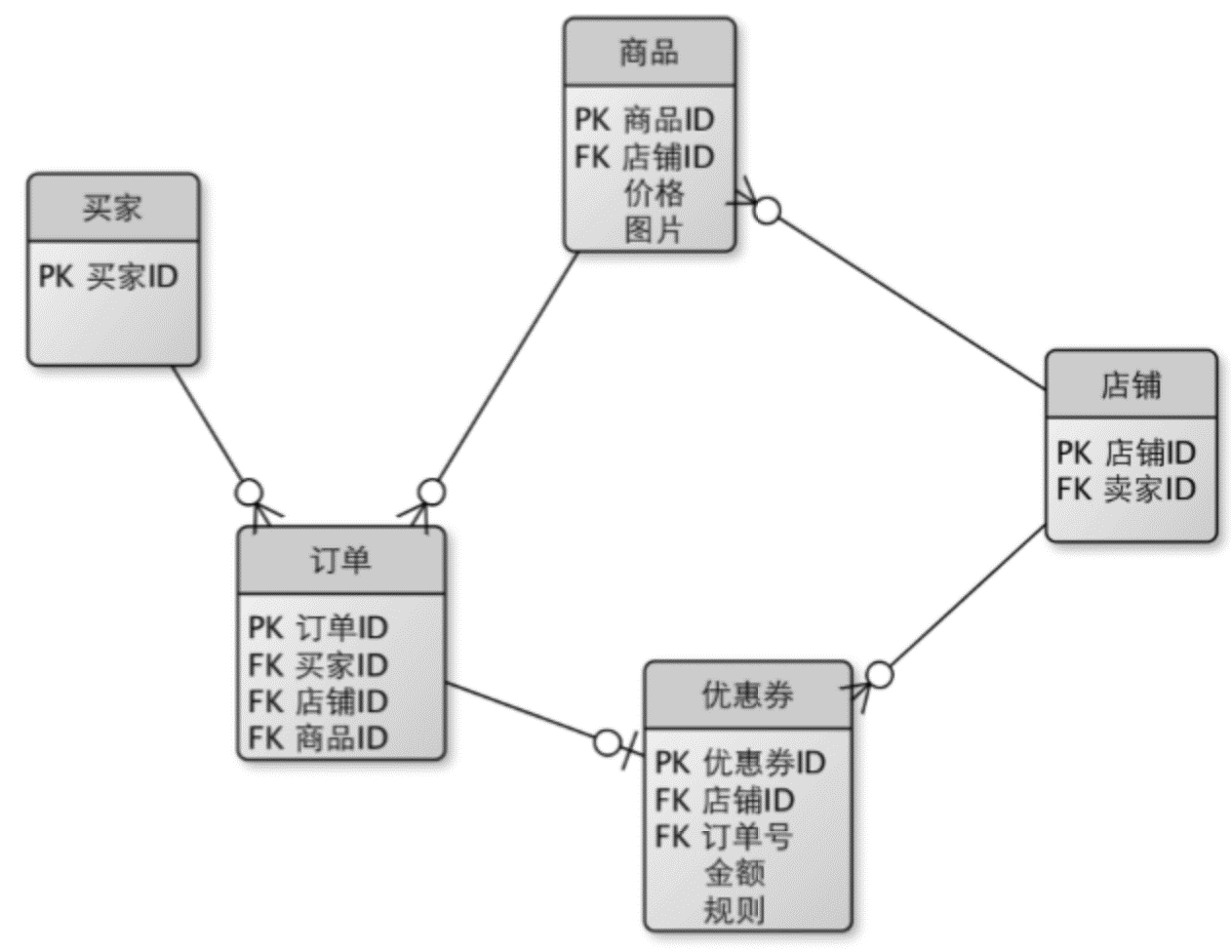 这一版很简单也很好理解,问题在于它将优惠券与商铺绑定,但优惠券有针对商品的、商铺的和平台的,比如X商铺A商品5折、X商铺满100减20,平台满200减20等,上面的结构明显不符合要求,所以他们改成如下结构: