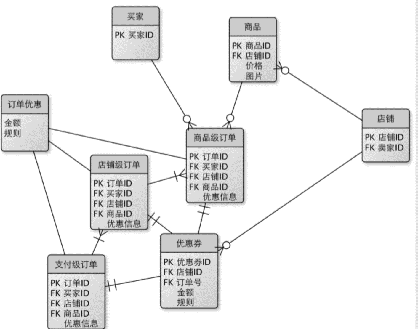 做法是将订单拆分成针对商品、店铺及平台(支付)的三类,一个支付订单可以包含一个或多个店铺订单,一个店铺订单可以包含一个或多个商品订单,问题解决了吗?的确从功能上看是满足了,但这种做法的后患是订单与优惠券完全绑定了,订单被优惠券绑架了,如果业务上又出现了针对不同类目的优惠(这很常见)那是不是又要加入类目级订单?