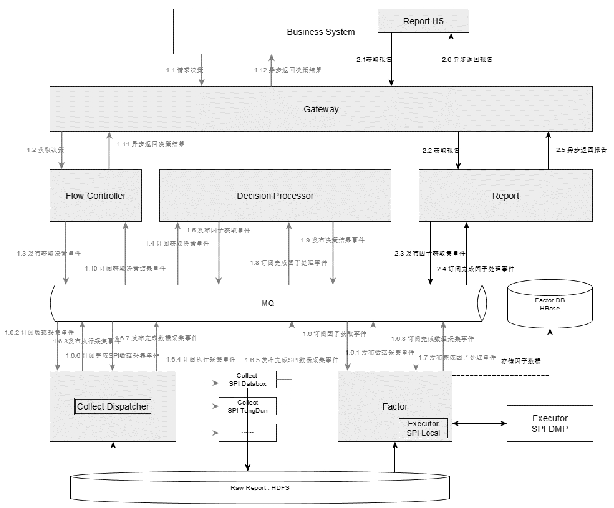 当然调用链路的长短也要看情况,比如笔者设计过的风控系统(见下图),它的一次风控决策最多就需要6层调用,请求从网关Gateway路由到流量控制器(Flow Controller),流量控制器负责在合适的时机发送请求事件到决策处理器(Decision Processor),决策处理器根据决策规则要求发布因子获取事件给因子服务(Factor),因子服务返回对应的因子数据给决策处理器以进行规则运算并异步回调业务请求方。但这一流程中如果因子数据不存在则因子服务要先请求数据采集分发器(Collect Dispatcher),数据采集分发器分发要采集的数据给对应的采集器,采集完成后逐级返回。这一系统通过MQ实现完全异步化处理,多层调用是为服务解耦,符合上述服务划分的要求,同时又因为是异步回调的方式,对实时性要求不高,所以这样的调用链路是可接受的。