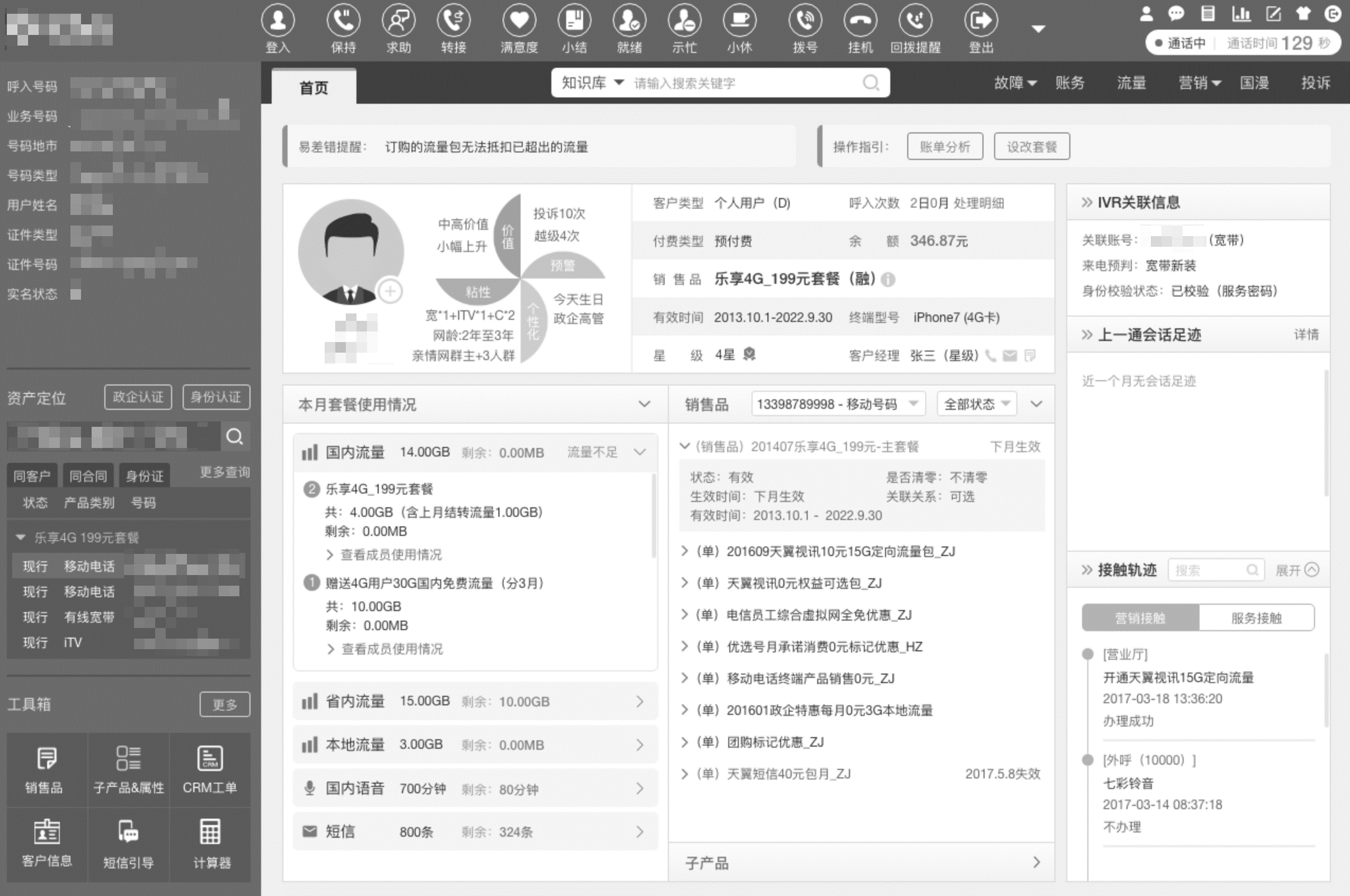 一个服务中如存在稳定和不稳定的模块,应该将两者拆分。 笔者曾经为某集团的客服系统做服务化改造,此系统有很多诸如本月套餐使用情况、销售品、IVR信息、通话足迹、故障分析等功能块,各个功能块要求可以动态添加、修改,根据客户画像、历史轨迹及当前资产等情况智能推测客户呼叫的意图,动态地为客服展现相关信息,如下图: