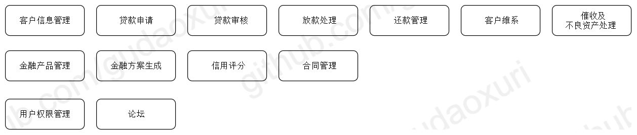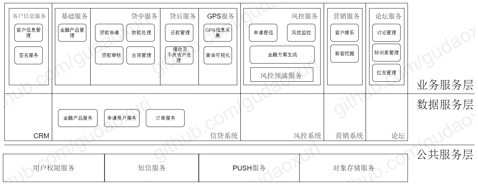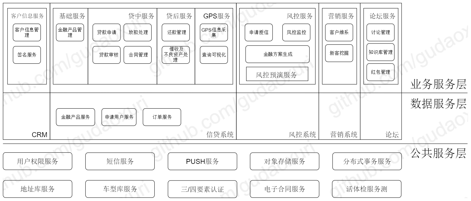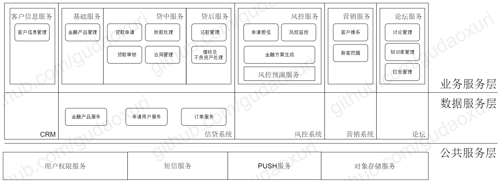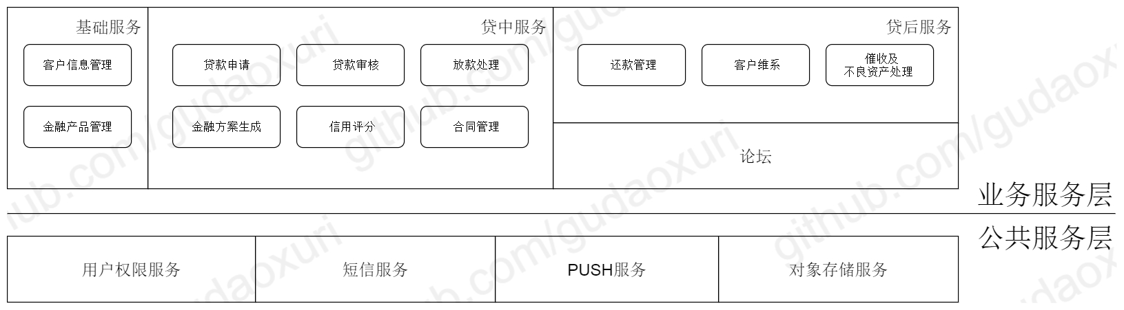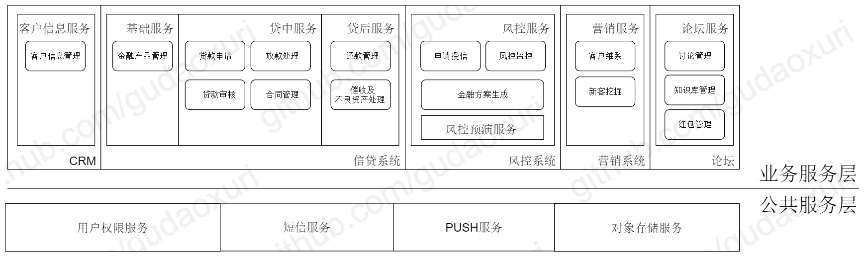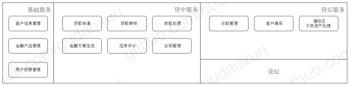 我们划分成四个服务:基础服务包含客户信息管理、金融产品管理及用户权限管理,所有贷款流程相关的都放在贷中服务,还款、客户维系、催收等划到贷后服务,论坛独立成一个服务。这样服务边界更清晰了,但是有如下几个问题: