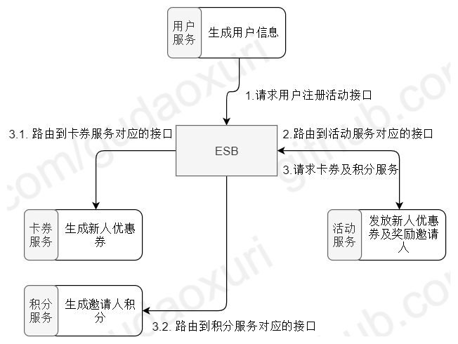 各服务间都通过ESB进行数据通信,用户注册后会向ESB发送调用活动服务的用户注册接口,ESB会将对应的请求路由给活动服务,活动服务收到请求并处理后又向ESB发送调用卡券服务生成卡券,调用积分服务生成积分,ESB路由此请求给卡券服务和积分服务。